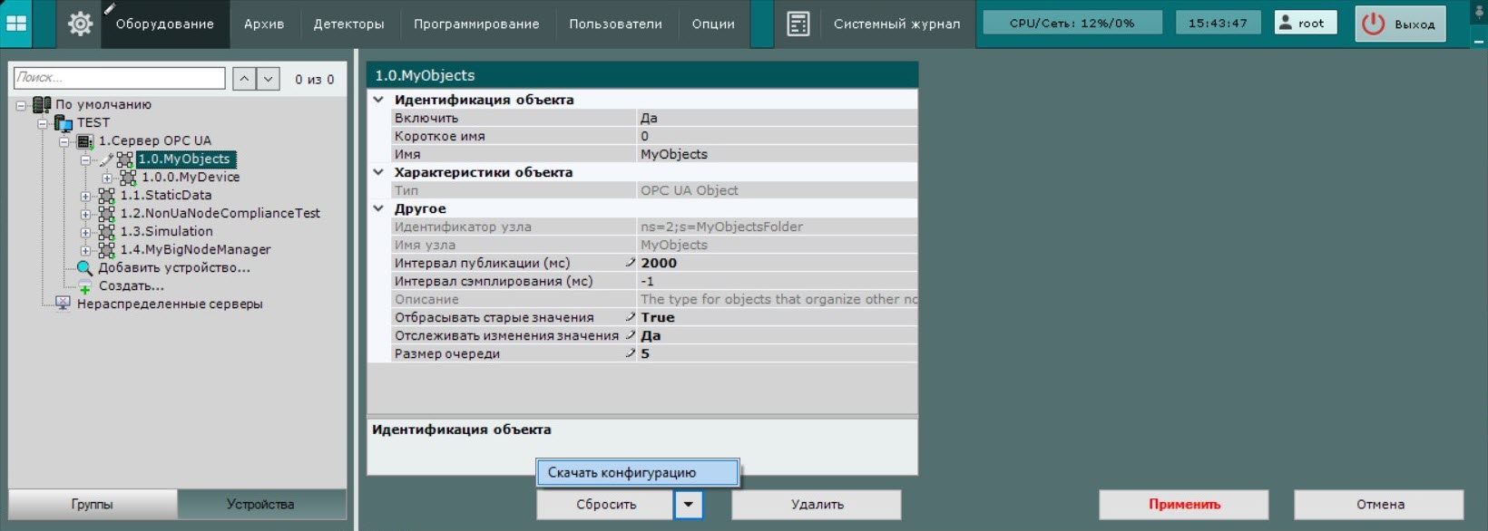 - Перейти на панель настройки объекта OPC UA Object, который создается автоматически в результате выгрузки конфигурации на базе объекта Сервер OPC UA (см. Настройка объекта модуля интеграции Сервер OPC UA).