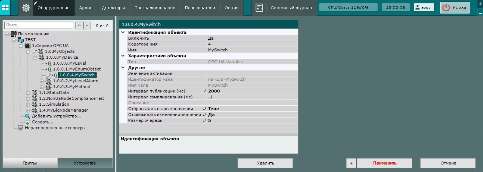 - Перейти на панель настройки объекта OPC UA Variable, который создается автоматически в результате выгрузки конфигурации на базе переменной Сервер OPC UA (см. Настройка переменной модуля интеграции Сервер OPC UA).