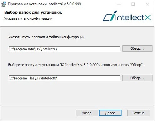 Указать путь к папке для установки ПК Интеллект X. По умолчанию ПК Интеллект X будет размещен в папке C:\Program Files\ITV\IntellectX\.