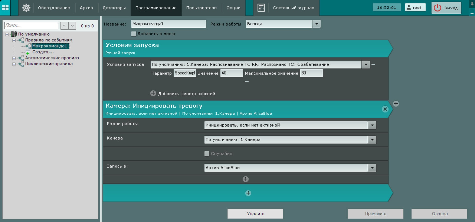Инициирование тревоги также возможно, если распознавание произошло при определенной скорости движения транспортного средства. Для настройки данной макрокоманды необходимо предварительно создать и настроить детектор Распознавание TC RR (см. Настройка детектора Распознавание TC RR). Также нужно в настройках детектора в параметре Определение скорости выбрать значение км/ч.