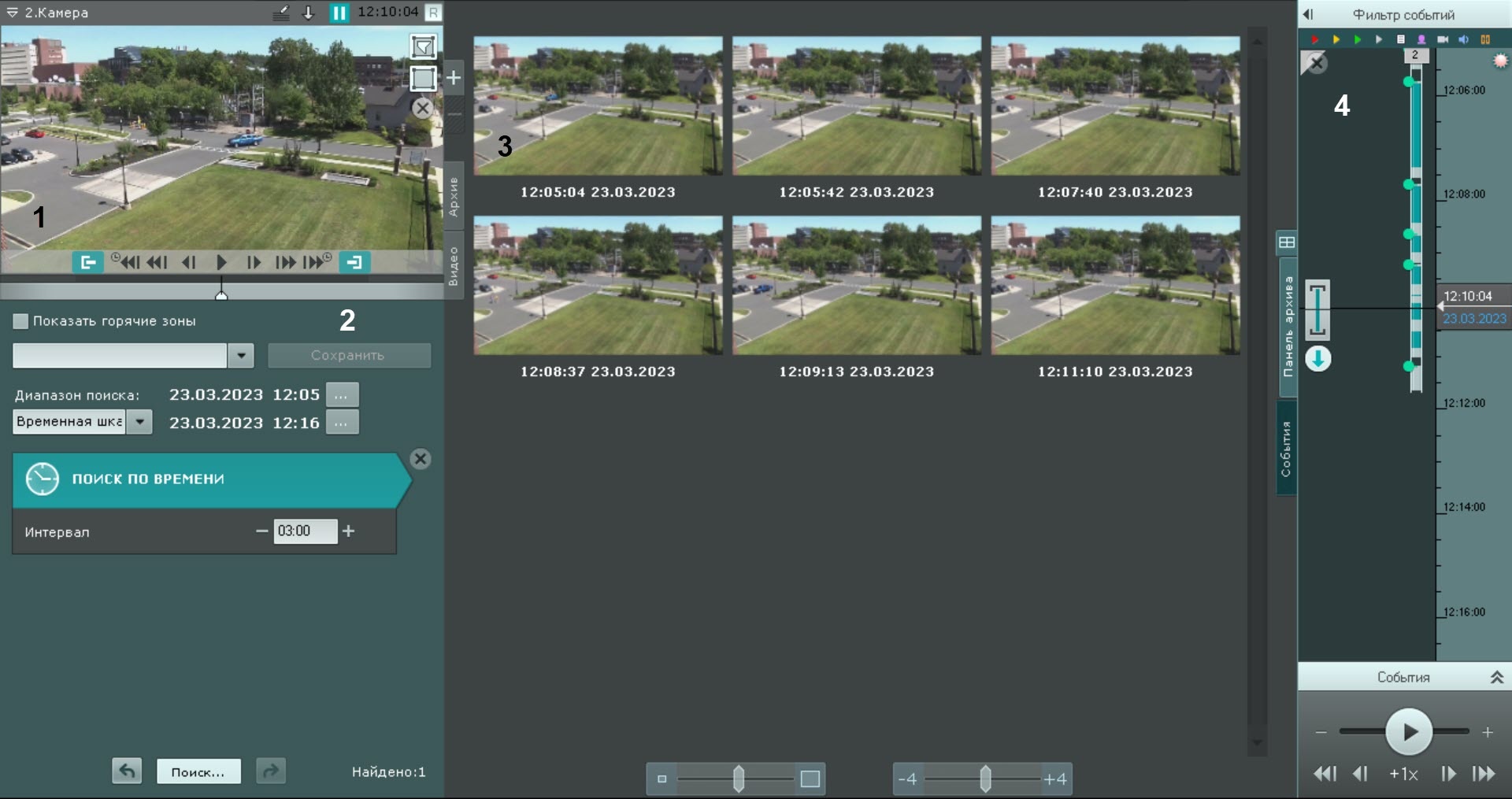 2. Панель управления поиском (2, см. Поиск в архиве одной камеры).