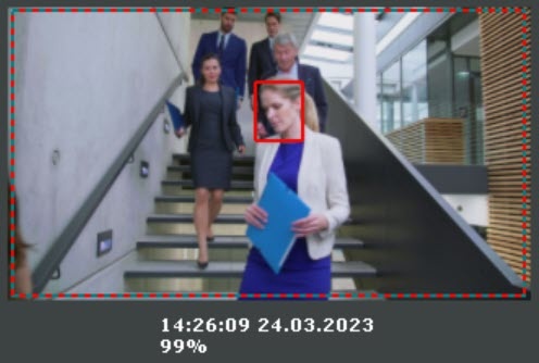 Запустится процесс поиска по заданным критериям. На панели результатов поиска отобразятся кадры видеоизображения, на которых есть лица, удовлетворяющие условиям поиска. Распознанное лицо будет выделено красной рамкой, а снизу будет указан уровень схожести лица в процентах.