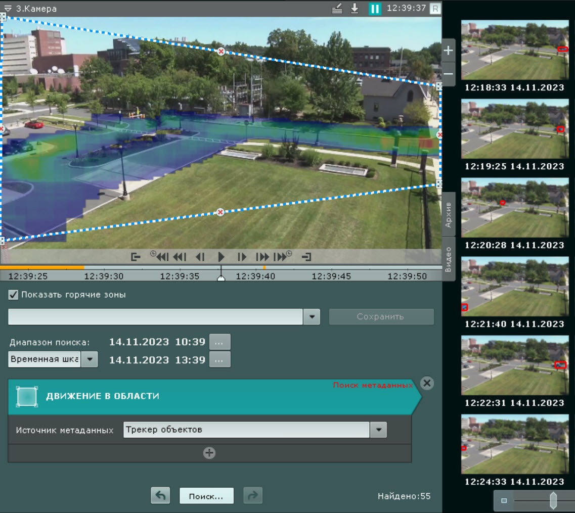 Чтобы задать дополнительные параметры поиска, необходимо нажать на кнопку Настройка параметров поиска). При задании дополнительных параметров будут отображаться только те зоны тепловой карты, в которых происходило движение объектов.