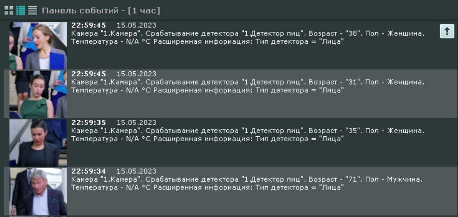 Если у детектора лиц активировано распознавание пола и возраста (см. Настройка детектора лиц TV, Настройка детектора лиц VI), то данная информация также отображается на панели и сохраняется в системный журнал.