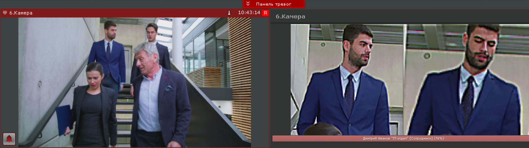 Если в системе созданы списки лиц, настроено инициирование тревожного события и окно видеонаблюдения связано с панелью сообщений в режиме отображения тревожного события (см. Примеры макрокоманд при работе со списками лиц), то при распознавании лица из списка на панели выводится следующая информация: