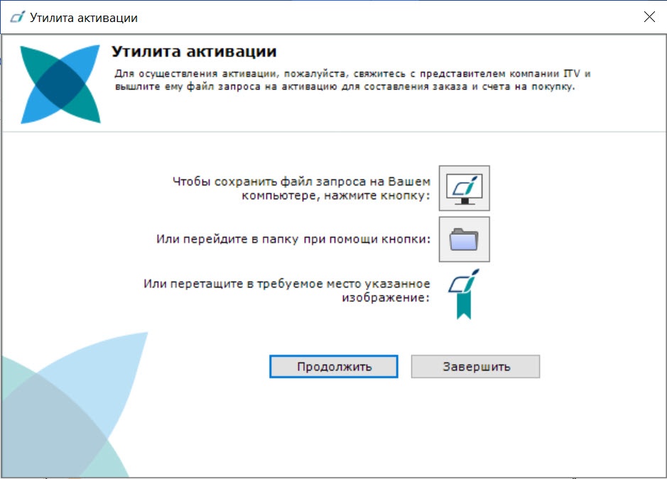 Создание запроса на активацию завершено. Для возврата на главную страницу утилиты активации необходимо нажать на кнопку Продолжить, для выхода − Завершить.