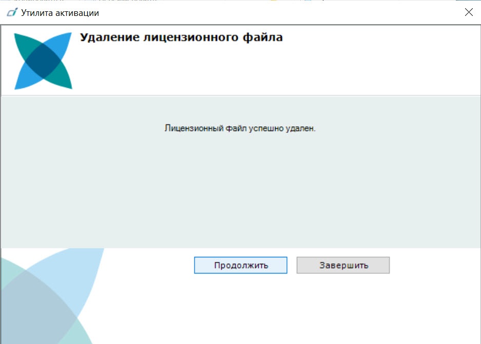 Удаление лицензионного файла из системы завершено. После удаления лицензионного файла из системы произойдет активация демо-лицензии. Для возврата на главную страницу утилиты активации необходимо нажать на кнопку Продолжить, для выхода − Завершить.