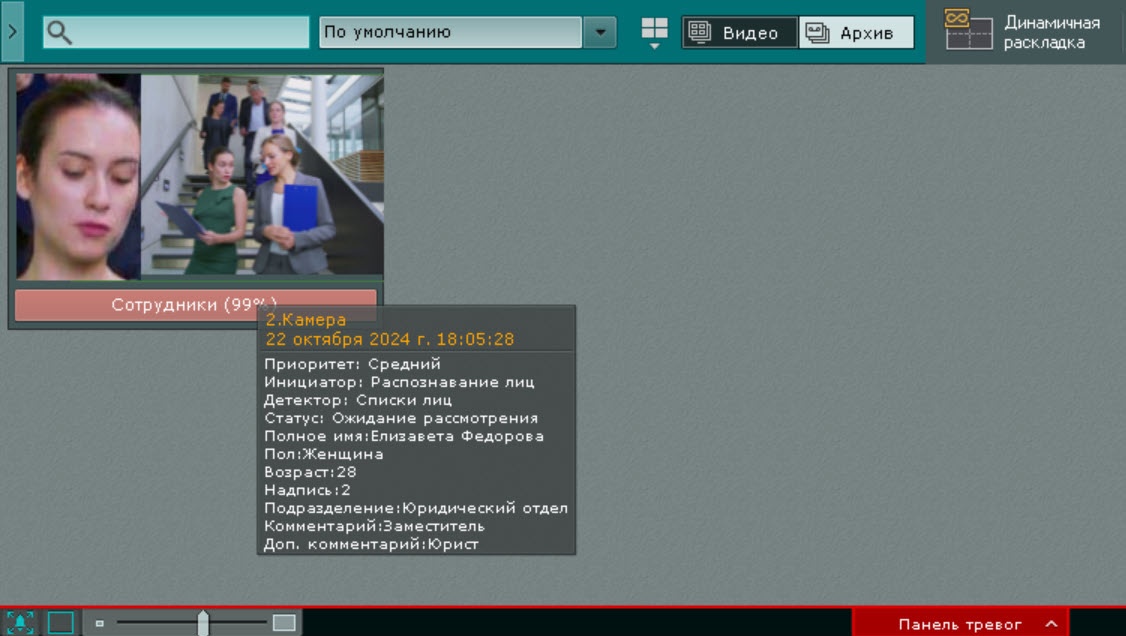 Также при возникновении тревоги по данной макрокоманде в панели тревог (см. Панель тревог) можно посмотреть дополнительную информацию о распознанном лице при наведении курсора мыши на видеофрагмент.