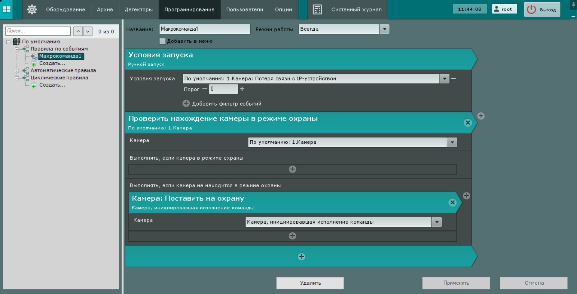 В параметре Выполнять, если камера не находится в режиме охраны выбрать действие, которое необходимо выполнить, если проверяемая камера не находится в режиме охраны.