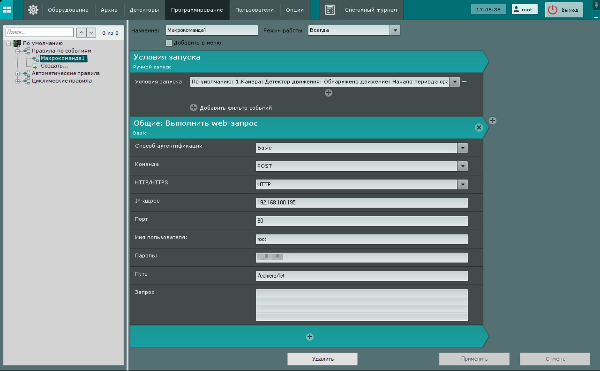 - Нажать на кнопку Создать... в списке Правила по событиям или Циклические правила (см. Конфигурирование макрокоманд).
