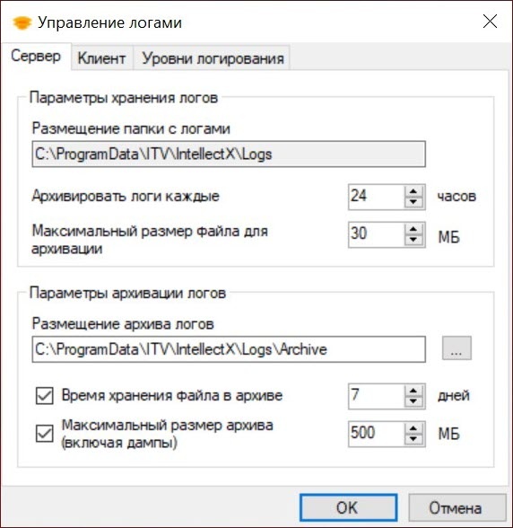 По умолчанию сведения обо всех системных событиях записываются в системный журнал ПК Интеллект X, хранящийся в локальной базе данных сервера (см. Системный журнал). Существует возможность записывать сведения о требуемых событиях в лог-файлы, хранящиеся в локальных директориях сервера. Архивация логов происходит с заданной частотой. Настройка указанных возможностей реализуется через утилиту Управление логированием.
