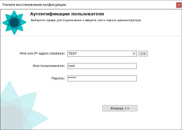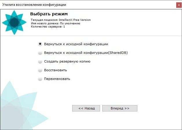 - Нажать на кнопку Вперед >>. В результате откроется окно настройки параметров восстановления конфигурации: