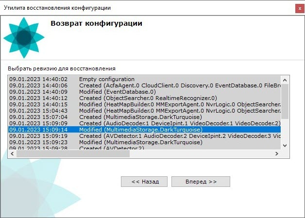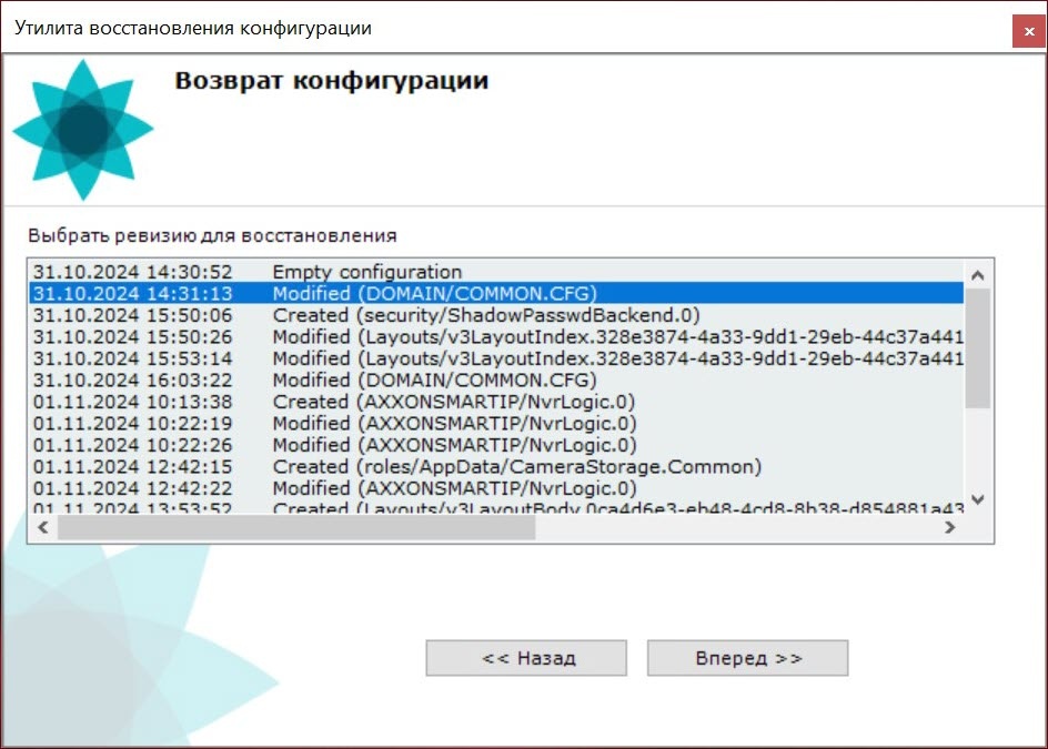 - Нажать на кнопку Вперед >>. В результате откроется окно, содержащее список доступных ревизий для восстановления конфигурации сервера с временем их создания и описанием того, что именно было изменено: