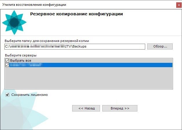 - В поле Выберите папку для сохранения резервной копии ввести полный путь к директории для сохранения резервной копии конфигурации. По умолчанию указан каталог <Cистемный диск>:\Users\<Текущий пользователь Windows>\documents\ITV\Backups. Для задания пути стандартными средствами ОС Windows нажать на кнопку Обзор....
