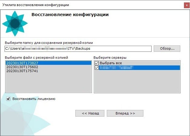- Установить флажок Восстановить лицензию для восстановления ключа лицензии, который сохранялся в момент создания резервной копии конфигурации (см. Создание резервной копии конфигурации). Если не восстанавливать лицензию, то ПК Интеллект X будет работать в демо-режиме.