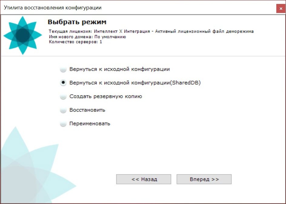 - Выбрать режим Вернуться к исходной конфигурации (SharedDB).