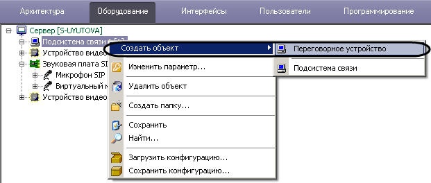 - Щелкнуть правой кнопкой мыши по выбранному объекту Подсистема связи и в появившемся контекстном меню выбрать пункт Создать объект > Переговорное устройство.