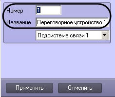 - В появившемся окне задать номер и название объекта Переговорное устройство, после чего нажать кнопку Применить.