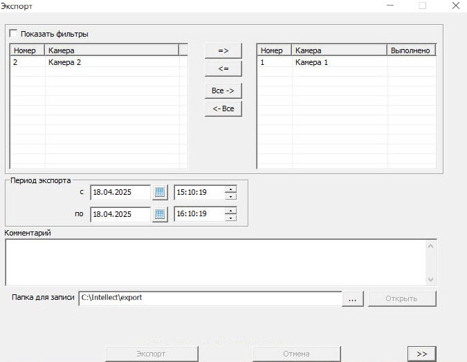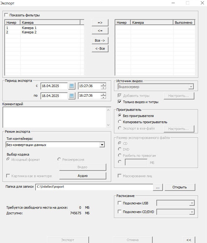 Утилита AviExport предназначена для экспорта видеоархива за указанный период в формате файловой системы ПК Интеллект или в формате AVI с возможностью изменения формата кодирования (кодека). Утилита позволяет экспортировать основной архив, архив видеошлюза и долговременный архив (см. также Общие сведения о работе с архивами).