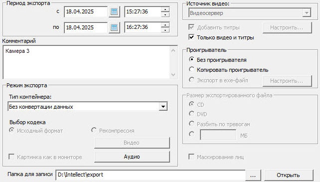 Данная настройка доступна в развернутом режиме окна Экспорт. Если она не отображается, следует нажать кнопку >> в правом нижнем углу окна утилиты. Если кнопка не отображается и в развернутом режиме, требуется установить параметр AviShowPlayerSection=1 ключа реестра HKEY_LOCAL_MACHINE\SOFTWARE\ITV\Intellect\Video\AviExport (см. Справочник ключей реестра).