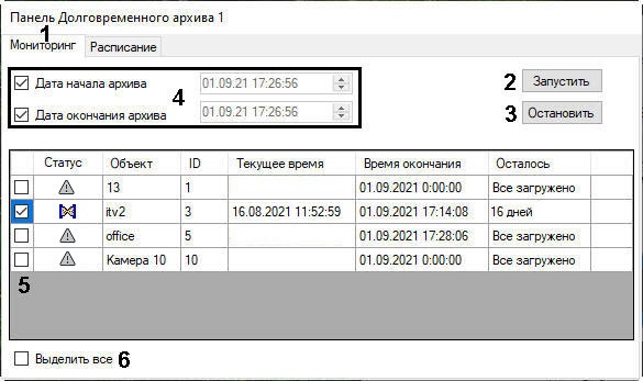 2. Выбрать видеокамеры, с которых будет осуществляться архивирование. Выбор видеокамер осуществляется установкой галочек напротив них (5). Кроме того, флажок Выделить все (6) служит для одновременного выбора (отмены выбора) всех видеокамер в таблице.
