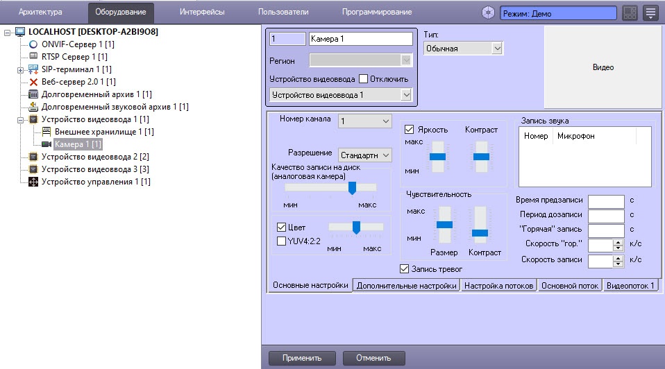 Для улучшения качества видеосигнала переместить ползунок Качество записи на диск (аналоговая камера) в сторону значения макс, для уменьшения объема видеопотока, поступающего с видеокамеры – в сторону значения мин.