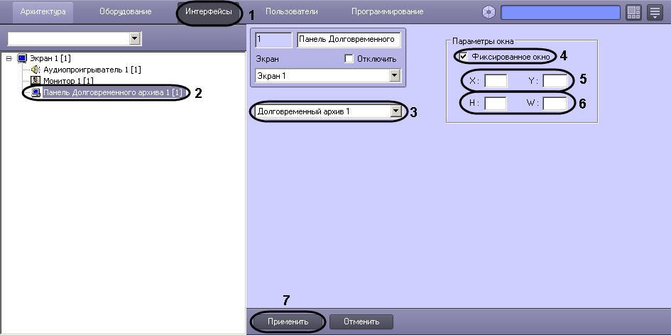 - В дереве объектов на вкладке Интерфейсы выбрать объект Панель Долговременного архива (2). В правой части вкладки Интерфейсы отобразится панель настройки выбранного объекта.