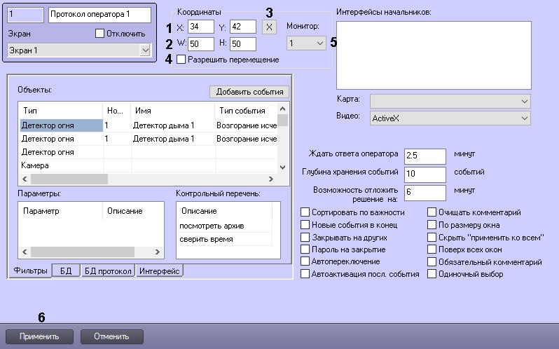 - Установить флажок Разрешить перемещение, если требуется вручную изменять расположение и размер интерфейсного окна Протокол оператора (4).
