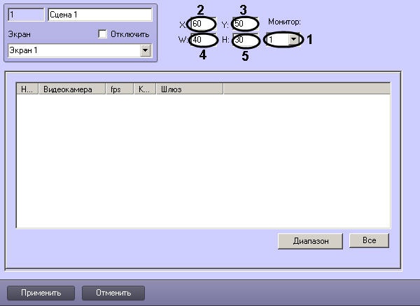 - Из раскрывающегося списка Монитор выбрать номер физического монитора на экран которого будет выведено окно панорамного видеонаблюдения (1).