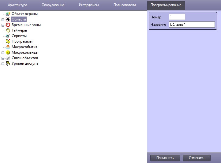 Области в ПК Интеллект реализованы при помощи одноименных объектов, создаваемых на вкладке Программирование. Объект Область не имеет своих настроек и предназначен для формирования разделов.