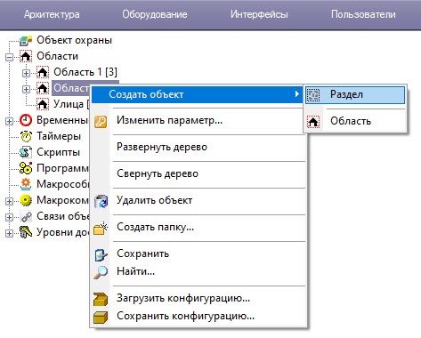 - В меню объекта Область выбрать пункт Создать объект => Раздел.