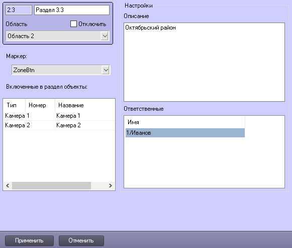 - Создать связи между объектом Раздел и объектами на вкладке Оборудование, которые войдут в раздел. Для этого на панели настройки выбранного объекта из списка Регион выбрать название созданного объект Раздел (см. раздел Примеры использования областей и разделов). После создания связей список объектов, добавленных в раздел, отобразится в таблице Включенные в раздел объекты на панели настройки объекта Раздел. Редактирование данной таблицы невозможно.