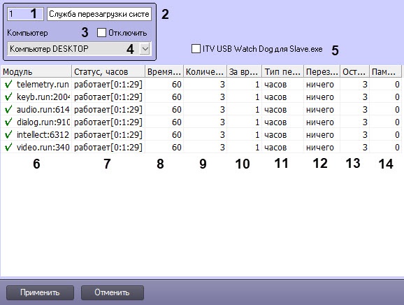 5 | Флажок ITV USB Watch Dog для Slave.exe | Устанавливается флажок | Активируется система автоматического перезапуска компьютера при отсутствии активности процесса slave.exe | Булевский тип | Нет | Да – система автоматического перезапуска активирована Нет – система автоматического перезапуска не активирована |