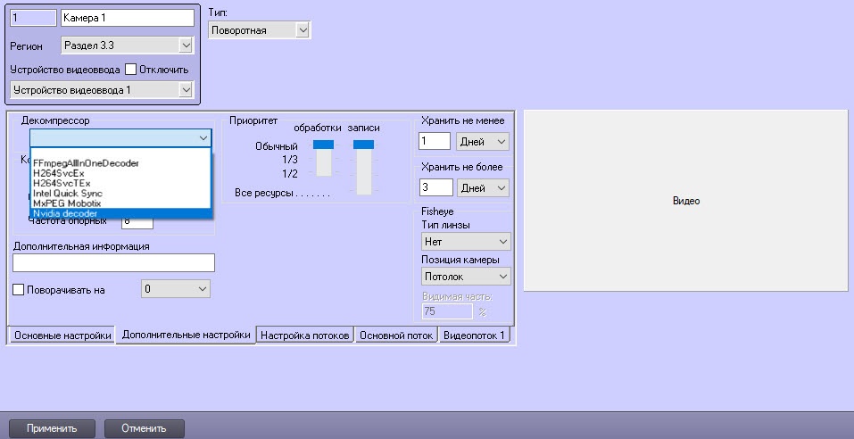 - Из раскрывающегося списка Декомпрессор выбрать значение Nvidia decoder.