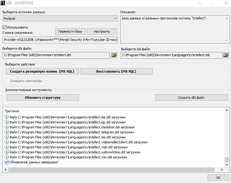 Для работы подсистемы отчетов, входящей в состав базового ПК Интеллект, используется способ вынесения протокола событий в отдельную базу данных, описанный в данном разделе, т.е. при помощи утилиты idb.exe. В подсистеме отчетов, входящей в состав базового ПК Интеллект, требуется настройка подключения к такой БД протокола, см. раздел Подключение к базе данных Протокол событий.