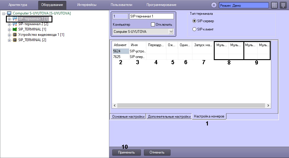 - На панели настройки объекта SIP-терминал перейти на вкладку Настройка номеров (1).