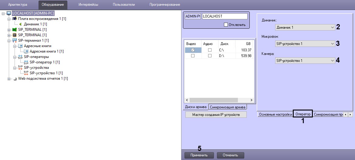 - Из раскрывающегося списка Микрофон выбрать микрофон оператора (3).