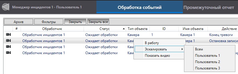 В настройках может быть задана возможность передачи события на обработку другому оператору системы − эскалация (см. Настройка прав пользователей в Менеджере инцидентов).