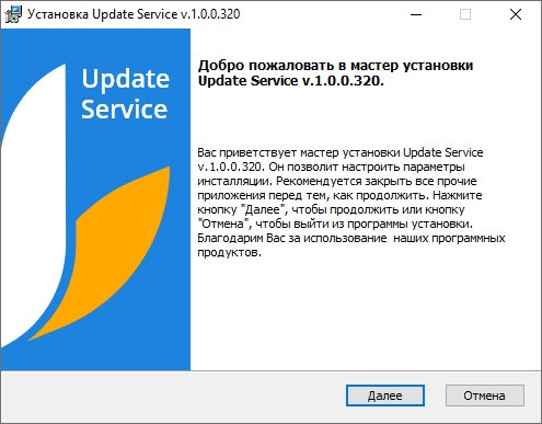 Также будет выведено окно выбора установки Update Service как сервиса (подробнее см. выше в пункте Установка клиента).