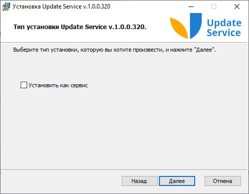 Также будет выведено окно выбора установки Update Service как сервиса (службы). Если требуется запускать Update Service до авторизации пользователя в операционной системе Windows и до запуска приложений Windows (в том числе приложения Explorer (Проводник), используемого для запуска интерфейсов как ОС Windows, так и различных установленных на Сервере приложений), установить флажок Установить как сервис.