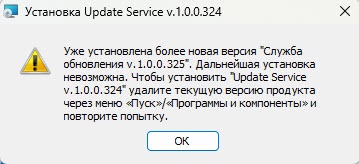 При попытке установить более старую версию Update Service появляется окно с предупреждением: