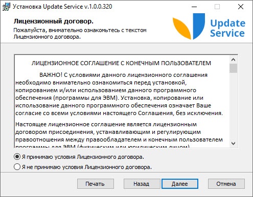 Лицензионное соглашение можно вывести на печать, для этого нажать кнопку Печать.