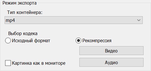 Настройка Режима экспорта − это выбор формата файла (тип контейнера) и кодека (исходный или заданная рекомпрессия):