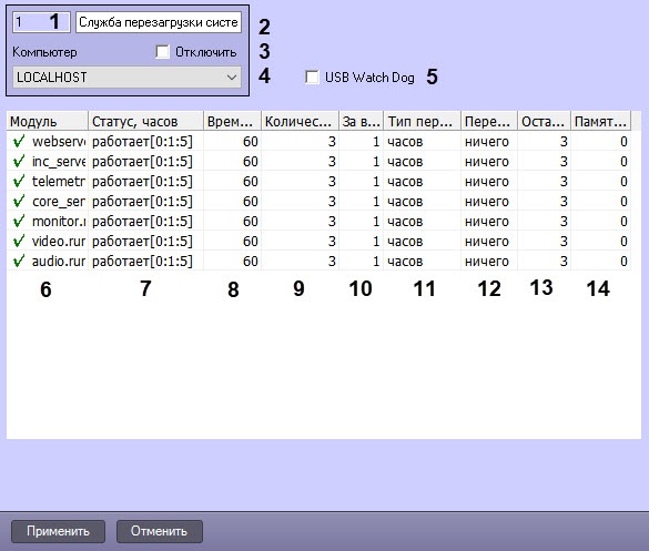 14 | Столбец Память (Mb) | Вводится значение в поле | Задается порог памяти, потребляемой модулем, по превышении которого требуется осуществлять перезапуск | Целые неотрицательные числа | 0 | От 0 и выше |