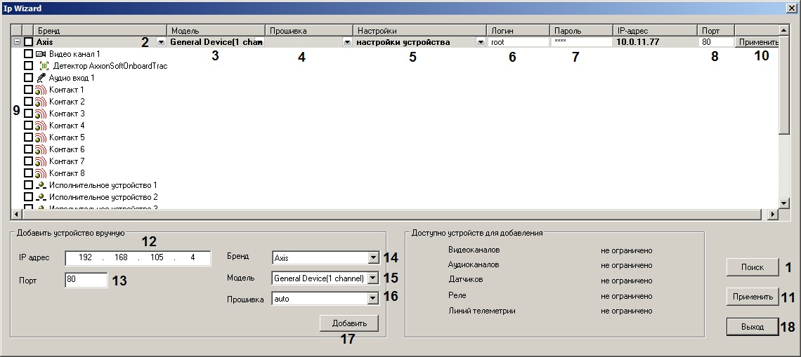 Устройства Axis имеют следующее ограничение: если логин и пароль для доступа к устройству не стандартные, при поиске невозможно определить количество каналов для устройства. По этой причине все неинтегрированные устройства, имеющие нестандартный логин и пароль, при поиске будут определяться как 1-канальные General Device.