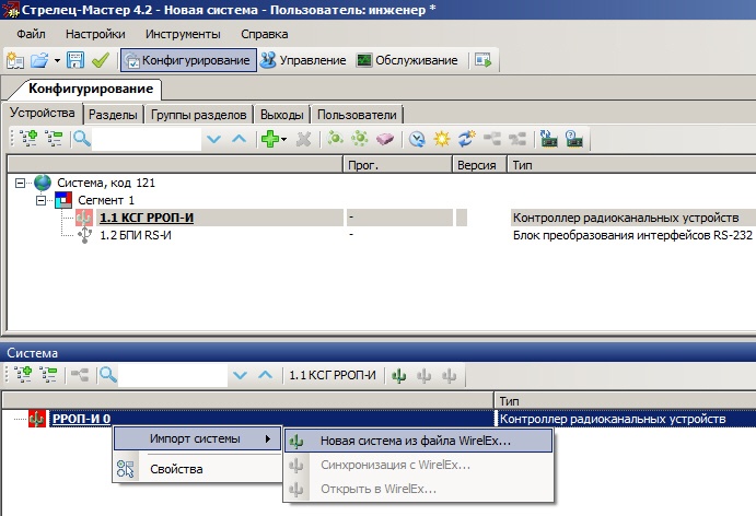 - Выбрать пункт Импорт системы - > Новая система из файла WirelEx… в контекстном меню элемента РРОП-И в поле Система.