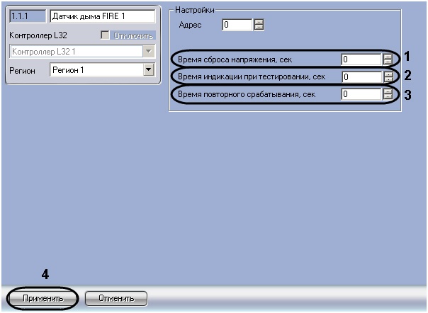 - Ввести в поле Время сброса напряжения, сек с помощью кнопок вверх-вниз период времени в секундах, в течение которого должна быть сброшено напряжение на датчике при обнаружении тревоги (1).