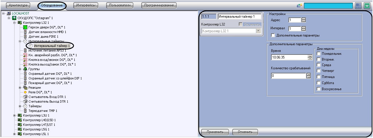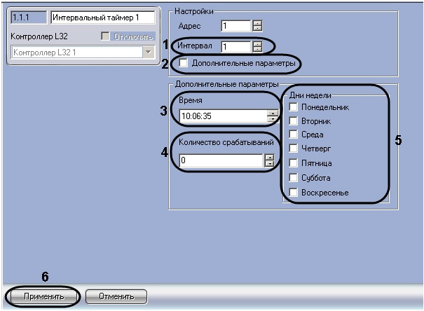 Настройка таймера производится на панели настроек объекта Интервальный таймер. Данный объект создается на базе объекта Контроллер L32 на вкладке Оборудование диалогового окна Настройка системы.
