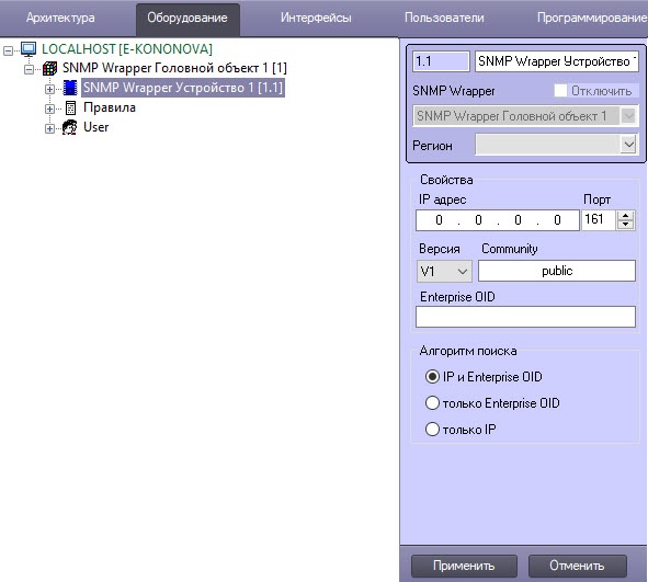 - Перейти на панель настроек объекта SNMP Wrapper Устройство, который создается на базе объекта SNMP Wrapper Головной объект.