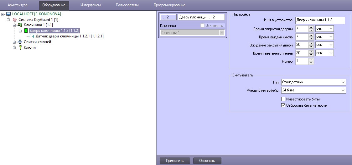 Конфигурирование двери ключницы KeyGuard происходит на панели настройки объекта Дверь ключницы, который создается на базе объекта Ключница на вкладке Оборудование диалогового окна Настройка системы.